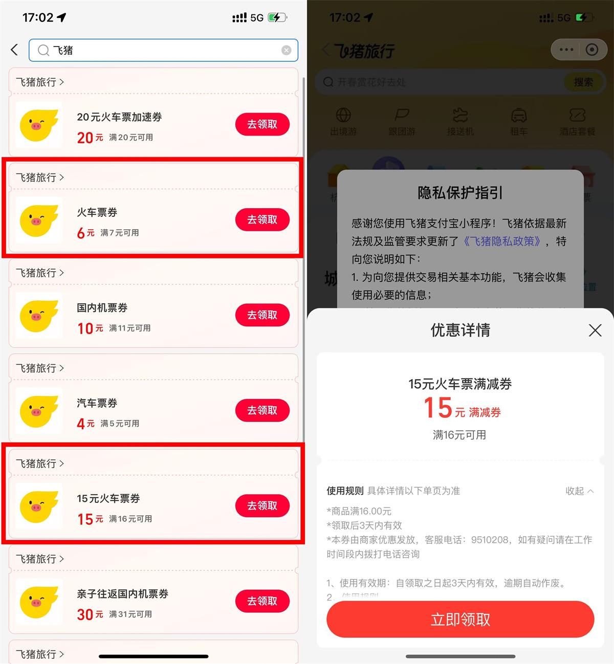 支付宝搜索“消费券”->进入再搜索“飞猪”->领16-15亓和7-6亓火车票券 ...